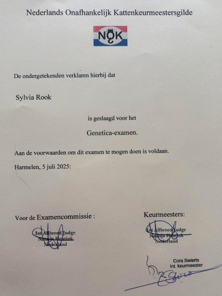 Bij de Nederlandse Onafhankelijke Keurmeestersvereniging (NOKK) heb ik de cursus Kattengenetica gevolgd en met succes afgerond met een examen.