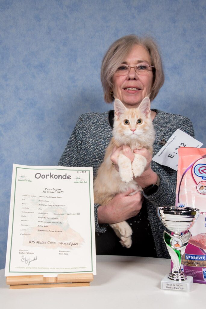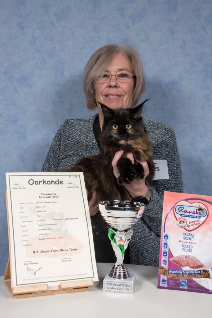 🏆 Glennaed’s Rosmerta Roos behaalde de titel Best in Variëteit in de categorie 6 tot 10 maanden. Een geweldige prestatie die haar schoonheid en kwaliteit als Maine Coon onderstreept!