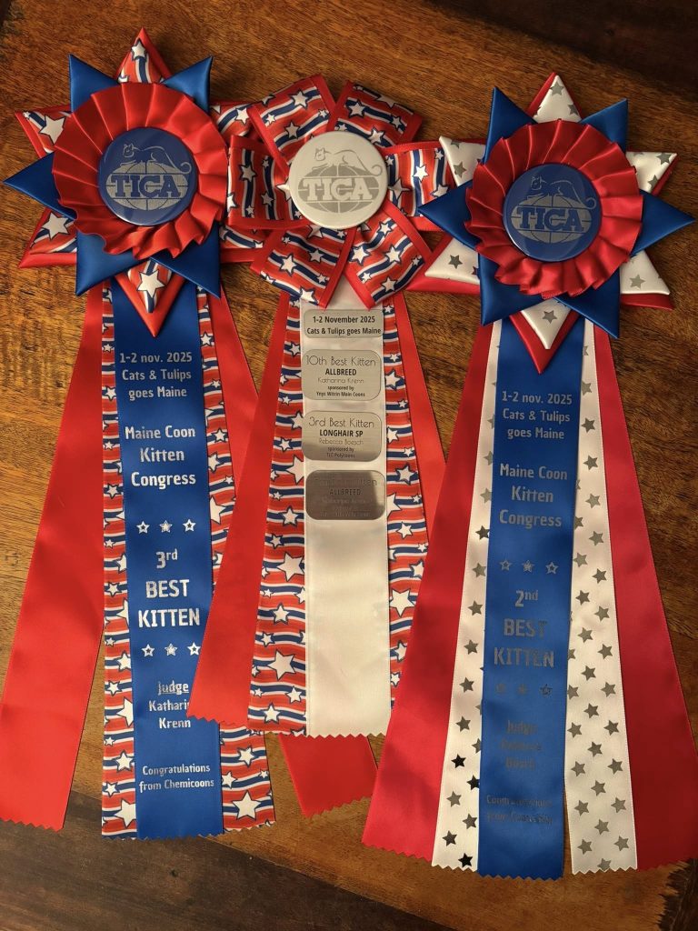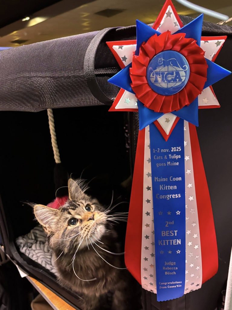 Beer heeft het fantastisch gedaan! Hij heeft meerdere finales gehaald en hoge ogen gegooid in de congressen, met als kers op de taart prachtige resultaten zoals 2e en 3e Beste Kitten in de Maine Coon Kitten Congressen. 🏅 We zijn ongelofelijk trots op zijn prestaties en hoe hij alles heeft ondergaan.